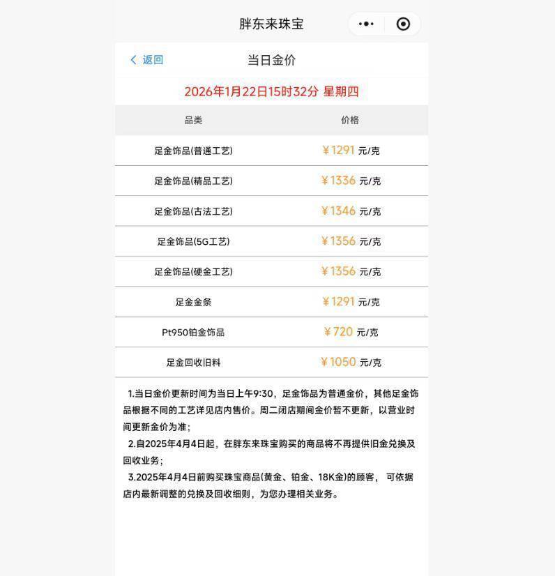 近日,国内金饰价钱合手续高涨,多家品牌金饰克价面临1500元。1月22日,#胖东来金饰每克低廉200元#话题登上热搜。极目新闻记者留神到,22日,胖东来珠宝的黄金饰品每克价钱最低为1291元,如实比国内品牌金店的金饰每克低廉200元。记者还留神到,由于胖东来的大部分金饰不加收加工费,其价钱不错比好意思深圳水贝市场的非品牌金饰,以致比海南免税店的品牌金饰还要低廉。由于到胖东来购买金饰需要破费者在阛阓50公里内提前预约,在二手平台,还有东谈主推出代预约劳动,其中购买黄金的代预约劳动费为50元。