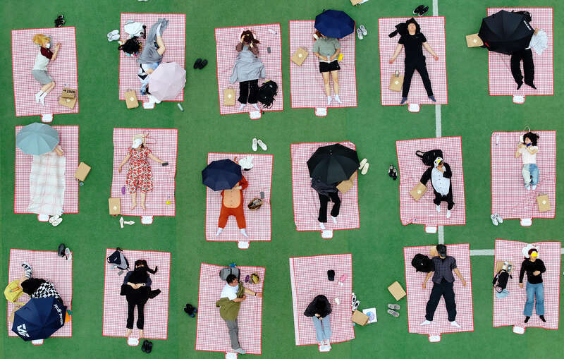 5月21日,韩国光州,朝鲜大学的体育场上,市民和学生参与者正在进行午睡大赛。视觉中国供图