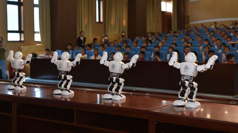 5月21日,安徽合肥,跃进小学,学生在不雅看机器东说念主饰演。视觉中国供图