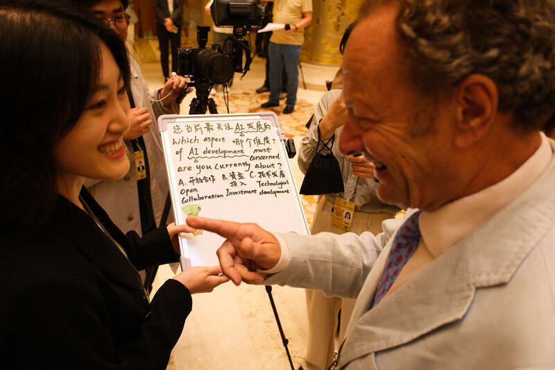 5月22日,北京,主题为“拥抱数智期间,联袂共同发展”的2025年公共营业投资促进峰会于当日举行。会前,别称记者手举提前准备好的手写板,请参会嘉宾选出“刻下最情切AI发展的维度”。中青报·中青网记者 田嘉硕/摄