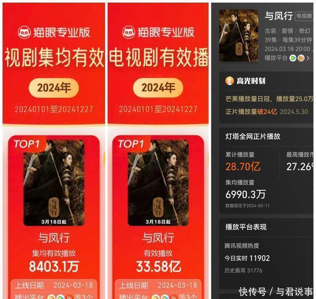 二、腾讯视频《与凤行》 由赵丽颖、林更新领衔主演的古装神话剧。 数据:集均6990.3万(累计超28.70亿)豆瓣评分30.8万东谈主评分7.2分。 《与凤行》被视作“中年古偶”到手转型标杆,在85花古偶中对比尽头显眼,杨幂《狐妖小红娘》和唐嫣《念无双》比拟,《与凤行》在播放量、口碑上均大幅跳跃,腾讯站内热度值破30000爆款剧集,微博剧集话题榜年度第一,抖音短视频播放量累计226亿,猫眼灵验播放量33.58亿,成为2024年猫眼灵验播放总榜冠军!