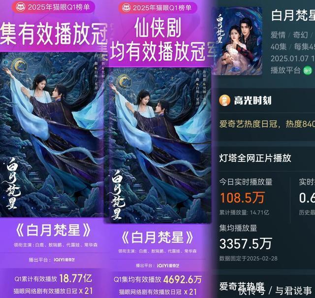 七、爱奇艺《白月梵星》 白鹿、敖瑞鹏、代露娃、常华森领衔主演的古装爱情仙侠剧。 数据:集均3357.5万(累计超14.71亿)在豆瓣高达19.5万东谈主评分,获得5.8分。 《白月梵星》投资3亿的S+仙侠剧,剧情新颖节拍快不吞吐,层层递进的魔幻冒险之旅。白鹿扮演的“大女主”白烁,成为1月猫眼最喜欢情剧变装,猫眼累计灵验播放量18.77亿,集均灵验播放4692.6万,成为灵验播放、集均灵验播放双榜冠军。爱奇艺站内热度峰值9637,首播热度破近三年记载,玄幻仙侠类剧集历史TOP2,成为平台年度爆款。