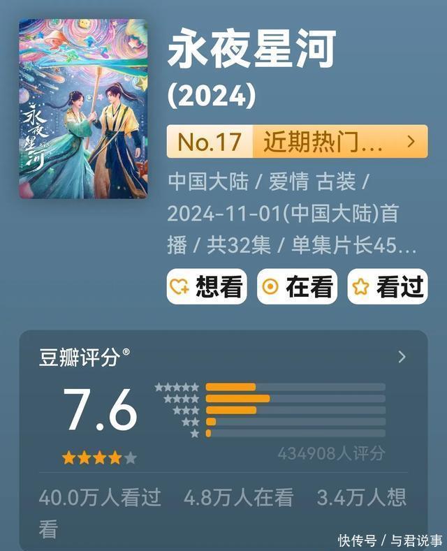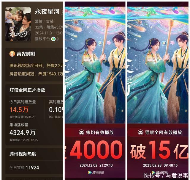 三、腾讯视频《长夜银河》 虞书欣、丁禹兮、祝绪丹,杨仕泽领衔主演的古装魔幻爱情剧。 该剧改编自白羽摘雕弓的演义《黑莲花攻略手册》 数据:集均4324.9万(累计超15.35亿)豆瓣评分43.4万东谈主评分7.6分。 《长夜银河》以快节拍穿书设定、轻笑剧立场,穿插“示寂重开”等游戏化情节设定,新颖高能的剧情,虞书欣手脚一番女主扛起剧集热度,其变装凌妙妙在抖音、小红书等平台数据断层跳跃,在腾讯视频站内热度最高达30361,抖音话题播放量290亿+,创下“最快破2亿点赞”,以及“年度女性变装播放量第一”等记载。