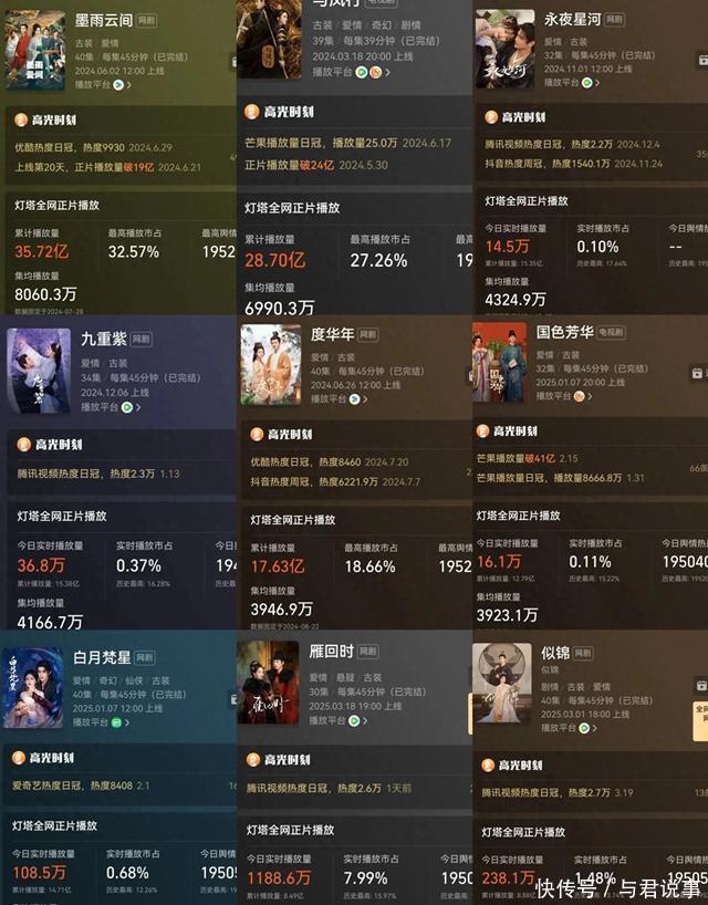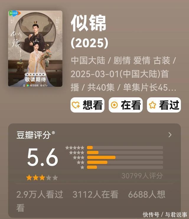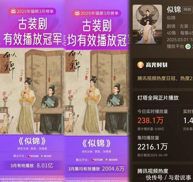 九、腾讯视频《繁花》 景甜、张晚意领衔主演的古装宅斗剧。 数据:集均2216万(累计超8.88亿)在豆瓣高达3万东谈主评分5.6分。 这部更生复仇宅斗“大女主”,景甜扮演姜似从一介的商户之女,她防御严慎,规画从填房丫鬟逆袭成诰命夫,腾讯视频站内热度峰值达28189,插足“必看俱乐部”。德塔文变装孝顺度达46.9%,景甜个东谈主抖音剧宣视频获140万点赞,云合数据集结多日登顶单日播放量榜首,成为猫眼2025年3月古装剧灵验播放、集均灵验播放榜双榜冠军!