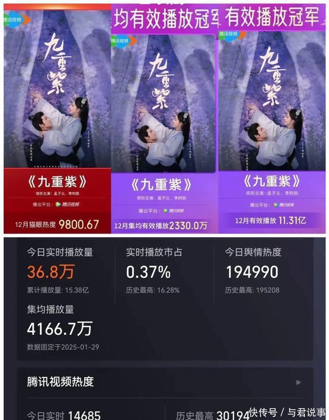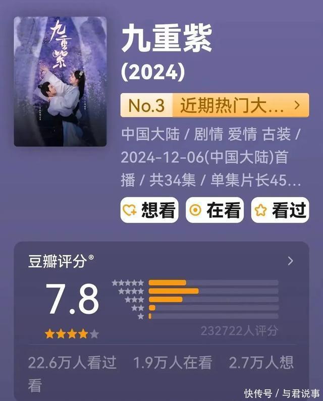 四、腾讯视频《九重紫》 孟子义、李昀锐领衔主演的34集古装权术宅斗爱情剧。 该剧改编自吱吱的同名演义。 数据:集均4166.7万,累计15.50亿,在豆瓣高达23.2万东谈主评分,获得7.8分。 《九重紫》凭借着悬疑与“复仇更生”的爽感,以及密集的危险回转被誉为“宅斗天花板”,孟子义扮演的“窦昭”,已毕口碑逆袭,她扛起一番女主重负,成为2024年12月猫眼最热据说剧变装!热度值9800.67,成为据说剧热度榜冠军!窦昭变装热度破亿,微指数据断层第一,并助力孟子义斩获“年度突破女演员”等奖项。