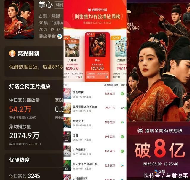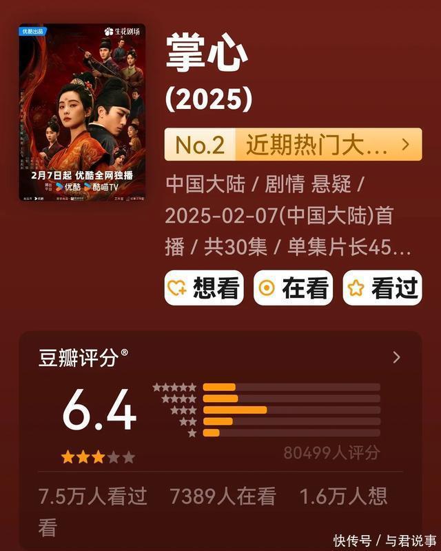 十、优酷视频《掌心》 刘诗诗、窦骁领衔主演,郑业成、宣璐特邀主演的古装复仇悬疑剧。 数据:集均2074.9万(累计超6.3亿)在豆瓣高达8万东谈主评分,获得6.4分。 《掌心》始创“女本位权术剧”新赛谈,属于年度最带感疯批“大女主”,刘诗诗扮演叶吉祥加害者与复仇者的双重身份的疯批,以身为饵布局复仇。刘诗诗扮演的“叶吉祥”成为第6周猫眼变装热度榜亚军。优酷站内热度最高达9065,后期口碑带动长尾效应,插足Q1古装网络热度榜TOP5!