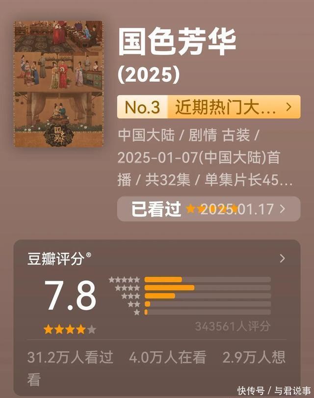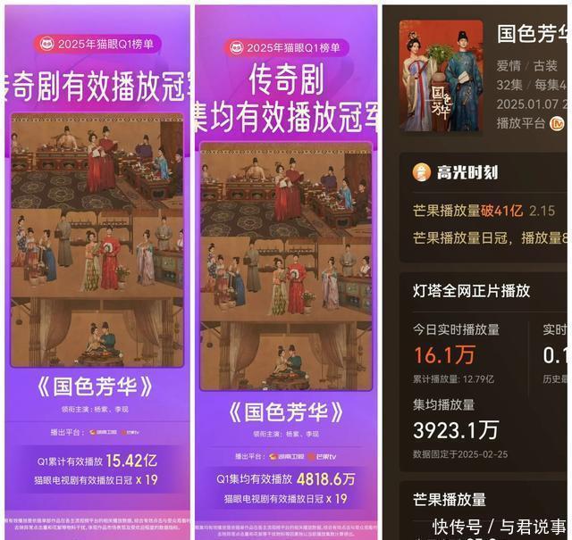 六、芒果TV《国色青春》 由丁梓光执导,张鸢盎编剧,杨紫、李现、魏哲鸣、张雅钦、涂松岩主演的古装女性励志剧。 数据:集均3923.1万,累计12.79亿,在豆瓣高达34.3万东谈主评分,获得7.8分。 2025开年杨紫大女主封神之作,在芒果台就以黑马之姿强势崛起,杨紫扮演的牡丹商女,从高门弃妇逆袭成大唐女首富,杨紫扮演“何惟芳”的成长与运谈起义,成为1月猫眼最热变装榜冠军,猫眼剧集热度榜抓续霸榜,全网灵验播放已超15.42亿,开播20分钟便登顶猫眼热度TOP1,热播期集均播放量达4818万。