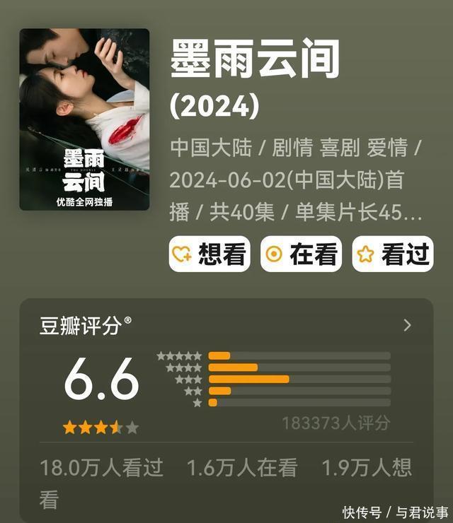 一、优酷视频《墨雨云间》 吴谨言、王星越、陈鑫海、陈乔恩、苏可、刘些宁、张雨绮、杨卓绝主演的古装爱情剧。 该剧改编自千山茶客的演义《嫡嫁令嫒》。 数据:集均8060.3万(累计超35.72亿)在豆瓣高达18.3万东谈主评分6.6分 2024年优酷平台时局级爆款的古装复仇爽剧,凭借高能剧情与吴谨言深通的演技,她将薛芳菲倔强感与破灭感,以及哑忍斗胆的复仇女性形象,塑造如“先天复仇圣体”,该剧连在优酷站内热度峰值超3万,并包揽猫眼、灯塔、德塔文等十余个榜单首位,创优酷年度多项数据记载。