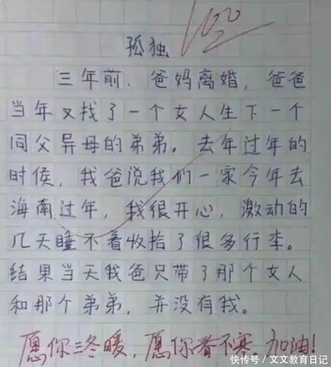 有一个孩子写谈“一身”这个词,原本他的父母三年前离异,父亲再婚又生了个弟弟。过年时他满心期待全家团圆,打理好了行李,成果父亲只带了弟弟和继母离开,把他一个东谈主留在原地。