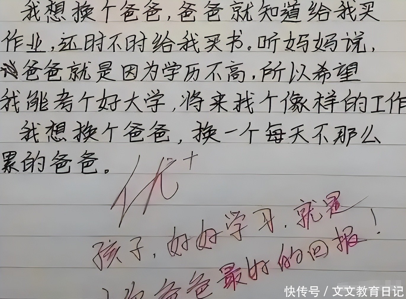 这篇作文滥觞写谈“我想换个爸爸”,事理是爸爸老是给他买功课和册本,自后才知道实在原因是爸爸因为我方学历不高,但愿孩子能考上好大学找个好责任,并且孩子把稳到爸爸每天责任太空泛,是以想换个不那么累的爸爸。