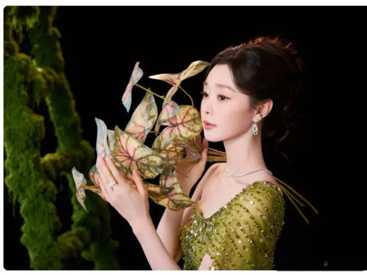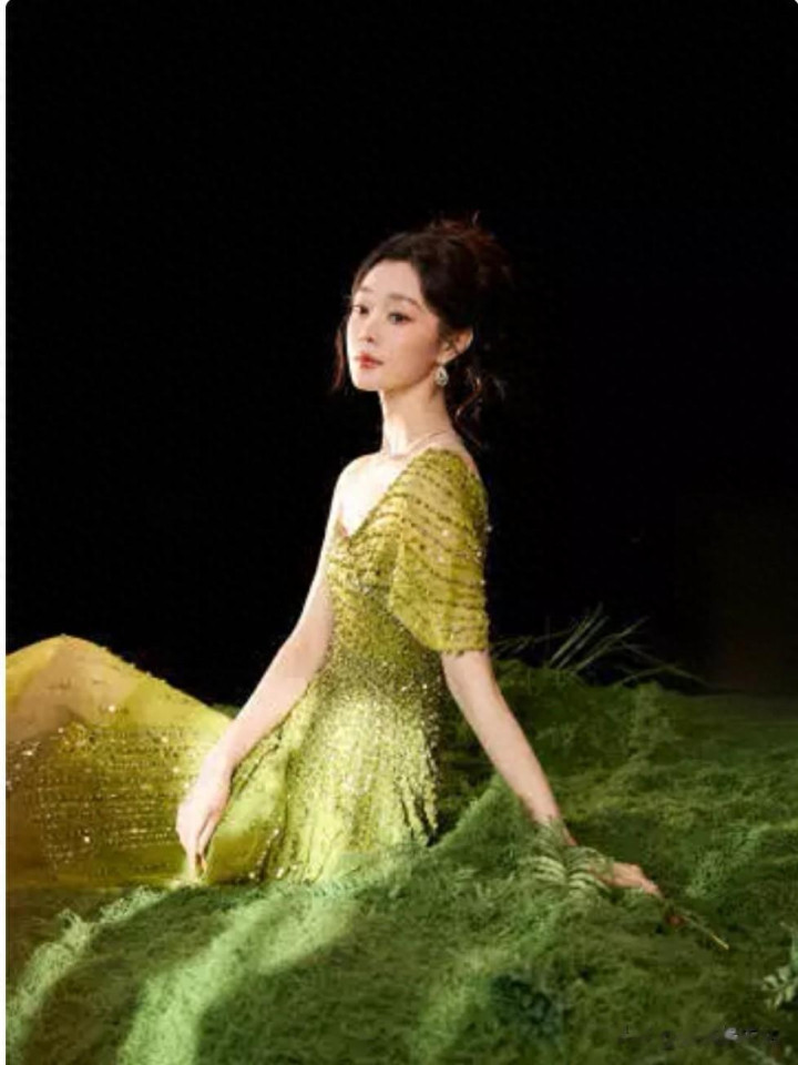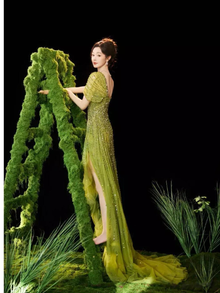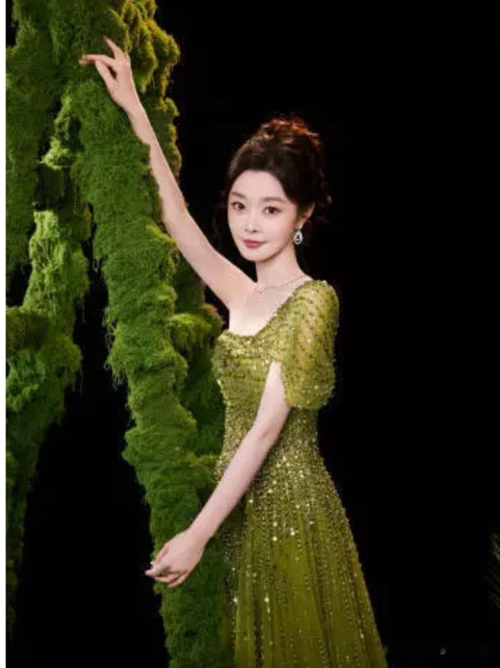 这条渐变青柠绿长裙号称造型师的巧想之作,从浅黄绿晕染至深青柠的颜色,仿佛将春日丛林的鲜嫩绿意穿在了身上。裙身缀满的碎钻与薄纱肌理交汇,来曩昔碎钻折射出细碎明后,薄纱裙摆轻扬如揉碎的蟾光,露背研究又恰到平允地勾画出她畅达的蝴蝶骨线条,将森系的灵动与高定治服的细巧圆善和会。单肩的剪裁更是放大了她的上风,天鹅颈与直角肩在绿意的衬托下愈发优厚,宛如林间舒展羽翼的精灵,每一个回身齐带着当然的呼吸感。