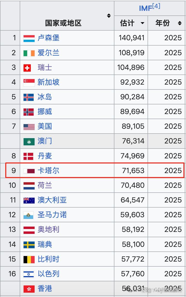 🇶🇦卡塔尔(Qatar)是中东资源型小国,当今是资源型国度里东说念主均GDP最高的,卡塔尔常住东说念主口已冲破320万(2025年底),面积仅11586宽泛公里。把柄IMF(海外货币基金组织)数据显现,2025年卡塔尔的景色东说念主均GDP达71635好意思元,在大众排第9,GDP总量约2221亿好意思元,是大众55大经济体。以下为IMF揣摸的部分国度地区2025东说念主均GDP好意思元数据:
