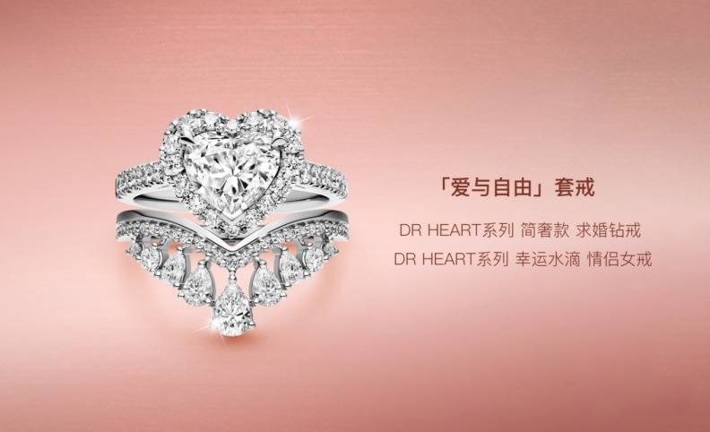 以DR爆火的符号款——DR HEART「爱与解放」套戒为例,该套戒由DR赤心戒和DR水点戒构成,主戒赤心戒灵感源于“爱神会赋予相爱的眷侣心型钤记,护佑他们一生一生”的陈旧神话,用独家「齐心切工」工艺,以13:14的极致比例以及58个切面,呈现“表里双心,交相衬映”的惊艳视觉成果,代表两颗双向奔赴的赤心。辅戒水点戒,则如9颗灵动水点,如同通盘交运和好意思好齐流向爱东谈主。当二者叠戴时,水点戒仿若一对翅膀托举主戒,暗喻“我是爱你的,你是解放的”。