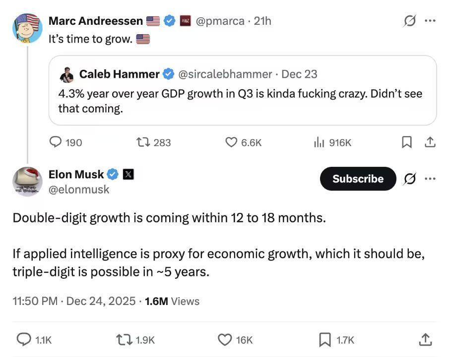 这一瞻望源于外交媒体上的一场扣问,好意思国最著明的投资者之一、硅谷风险投资公司Andreessen Horowitz的相接创举东谈主马克·安德里森(Marc Andreessen)对一篇揭示好意思国GDP增长不测强盛的帖子作念出了回话。他写谈,“是时辰增长了。”马斯克的瞻望恰是手脚对安德里森响应的回复。