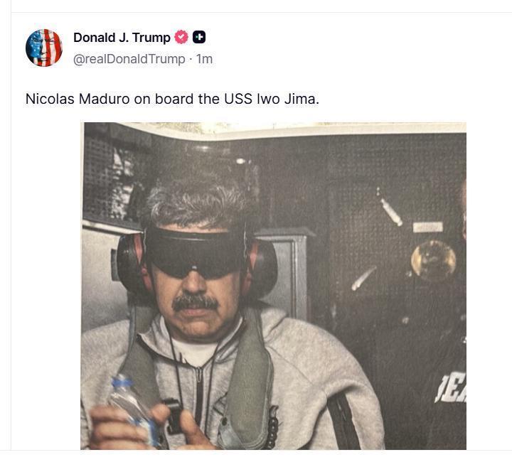 特朗普在社交媒体发布马杜罗在好意思战船上戴手铐、双眼被蒙住的像片